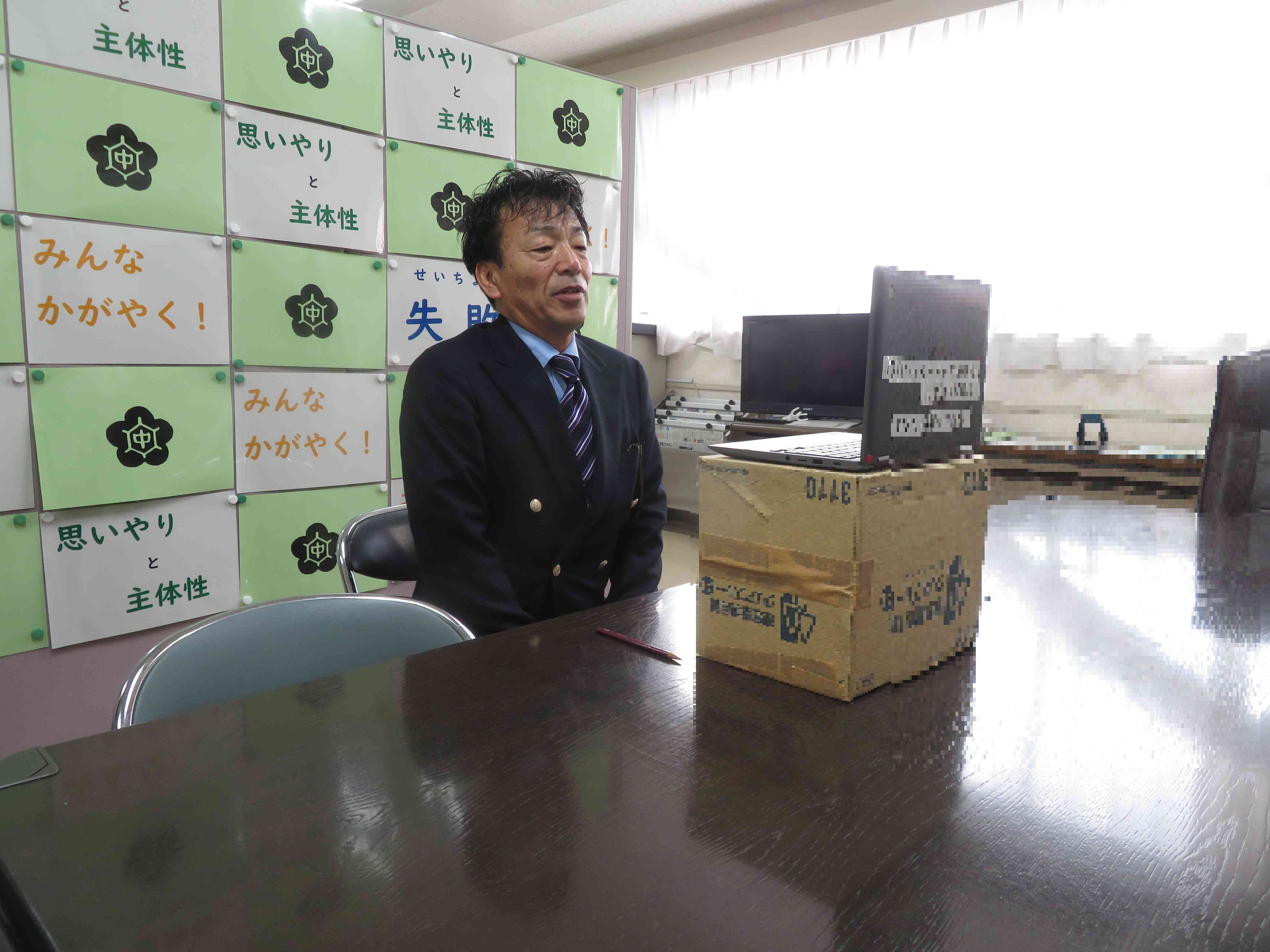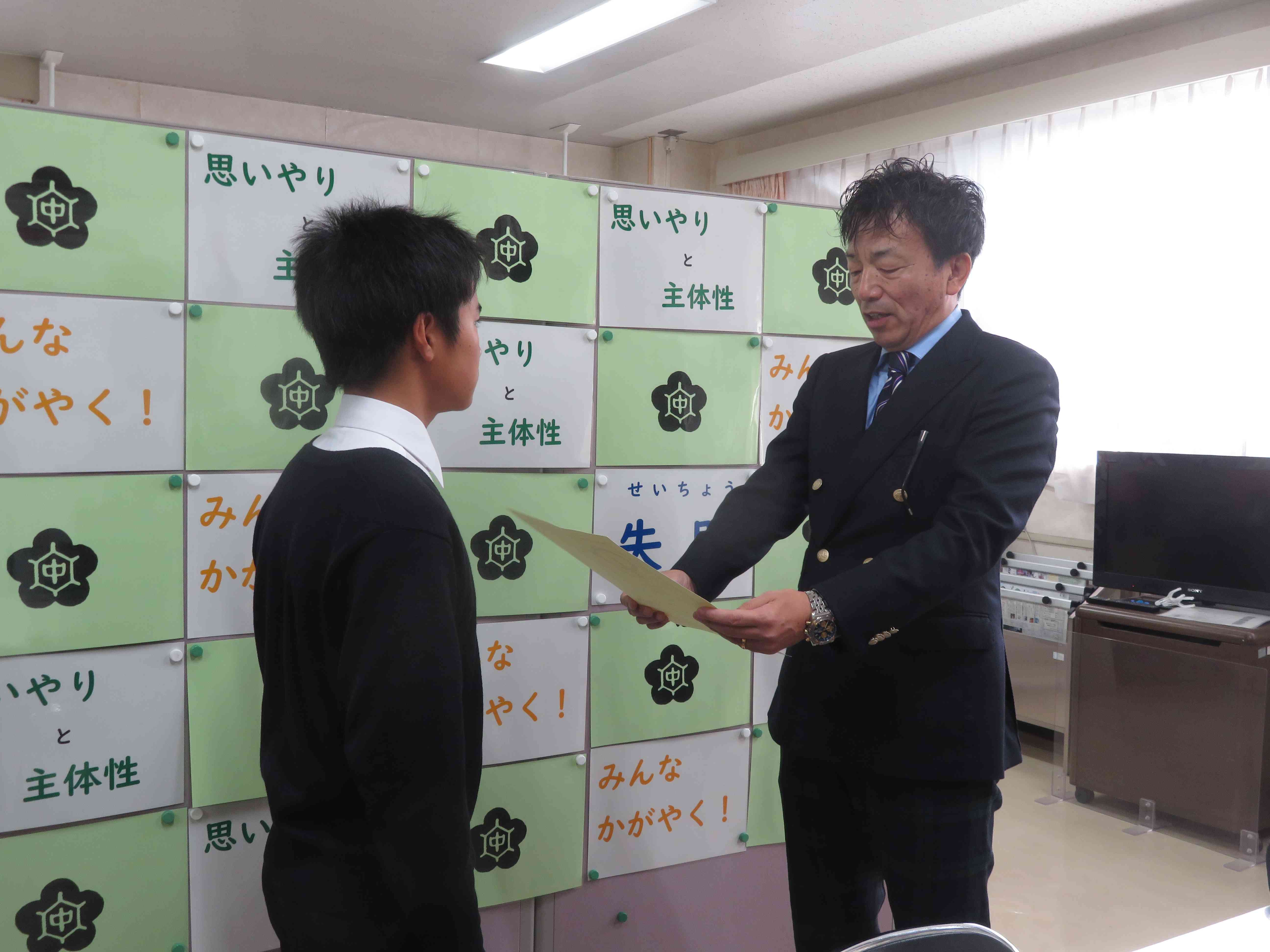 全校朝礼(オンライン)の様子です。校長先生・生活指導主任に話しのあとで表彰を行いました。