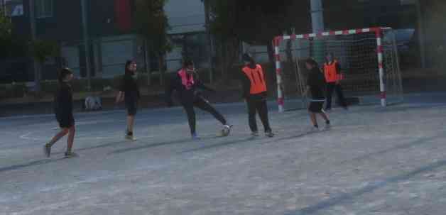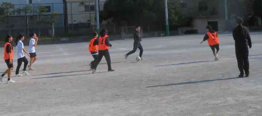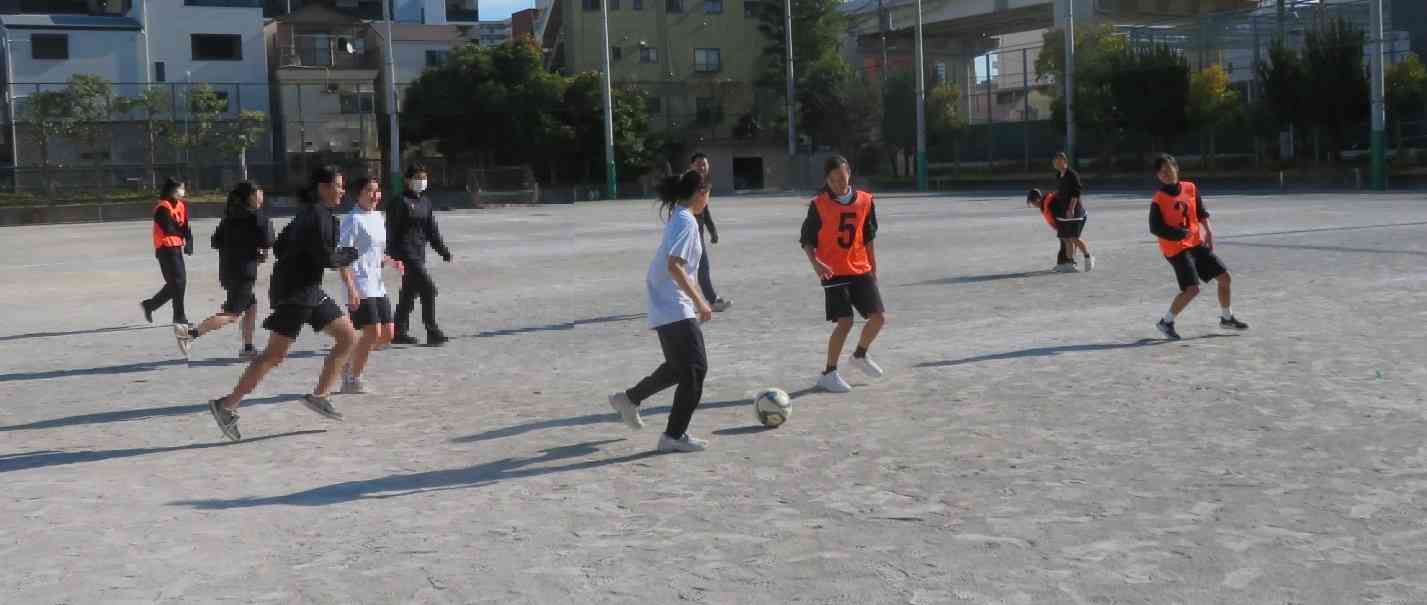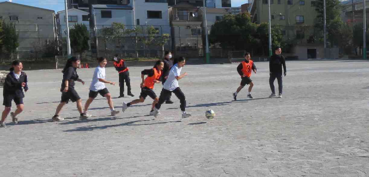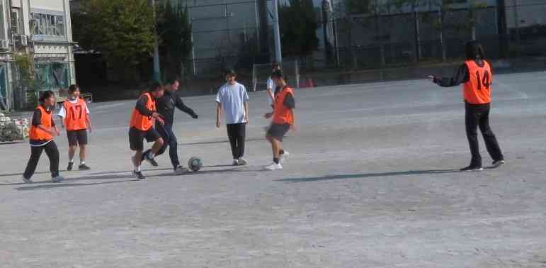 先生の華麗なドリブルに、生徒は声援を送りながらプレーをしています。和気あいあいとした雰囲気で観ている方が楽しくなります。