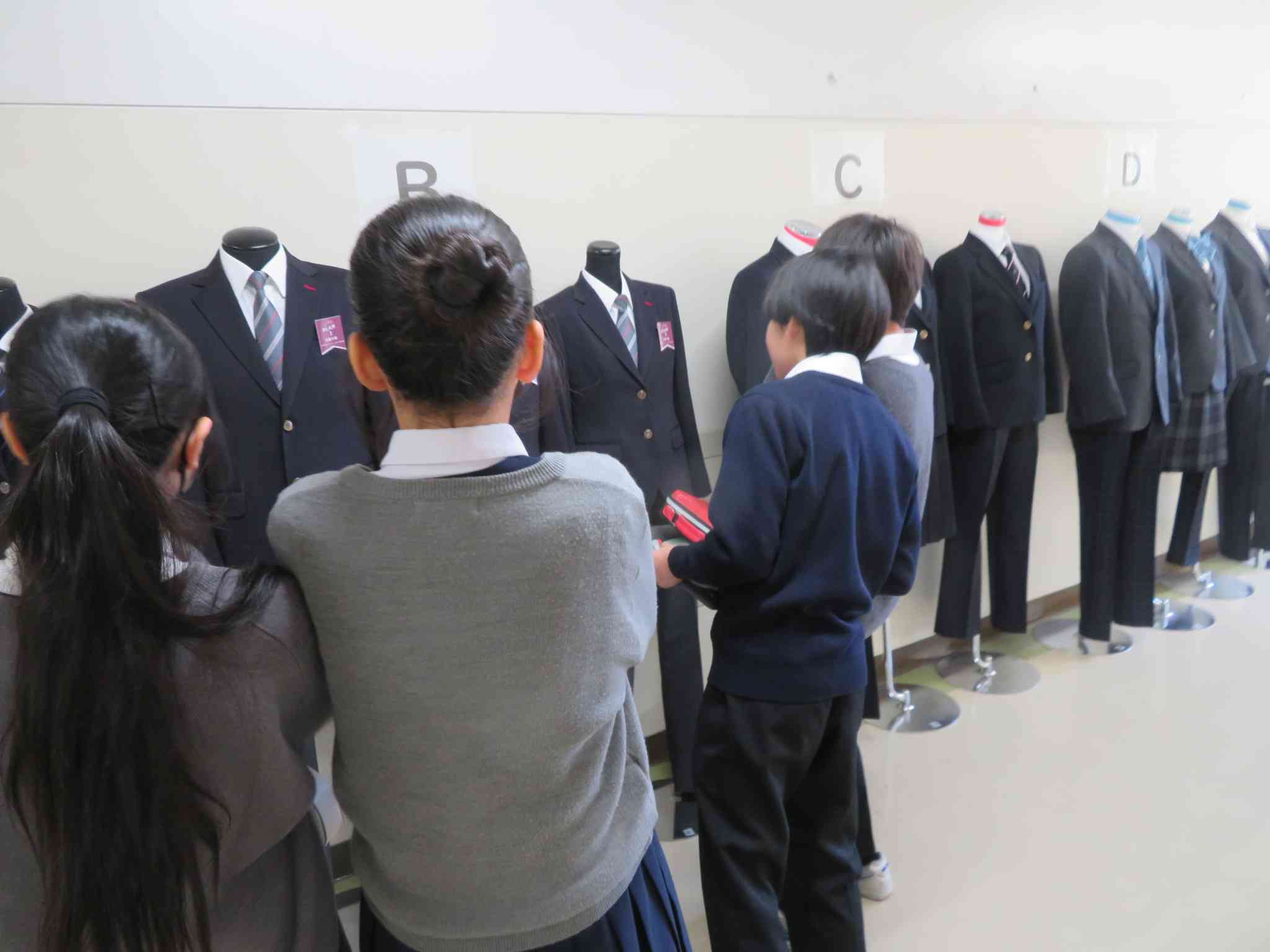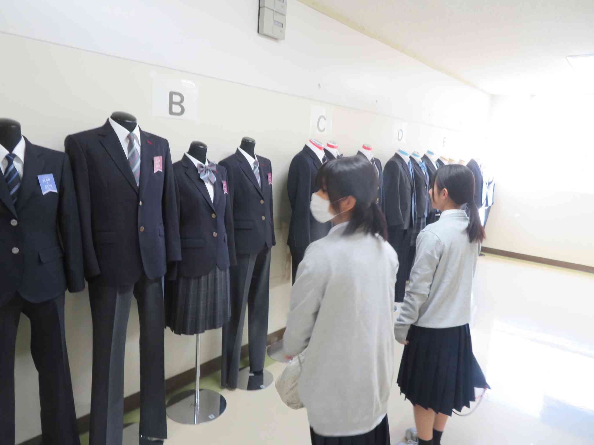 休み時間の度に多くの生徒が校長先生前の新標準服候補のサンプルを見に来ます。 6つのサンプルから今週土曜日の学校評議員・保護者の投票、来週月曜日の生徒・教員の投票で令和9年度から採用する標準服が決定します。