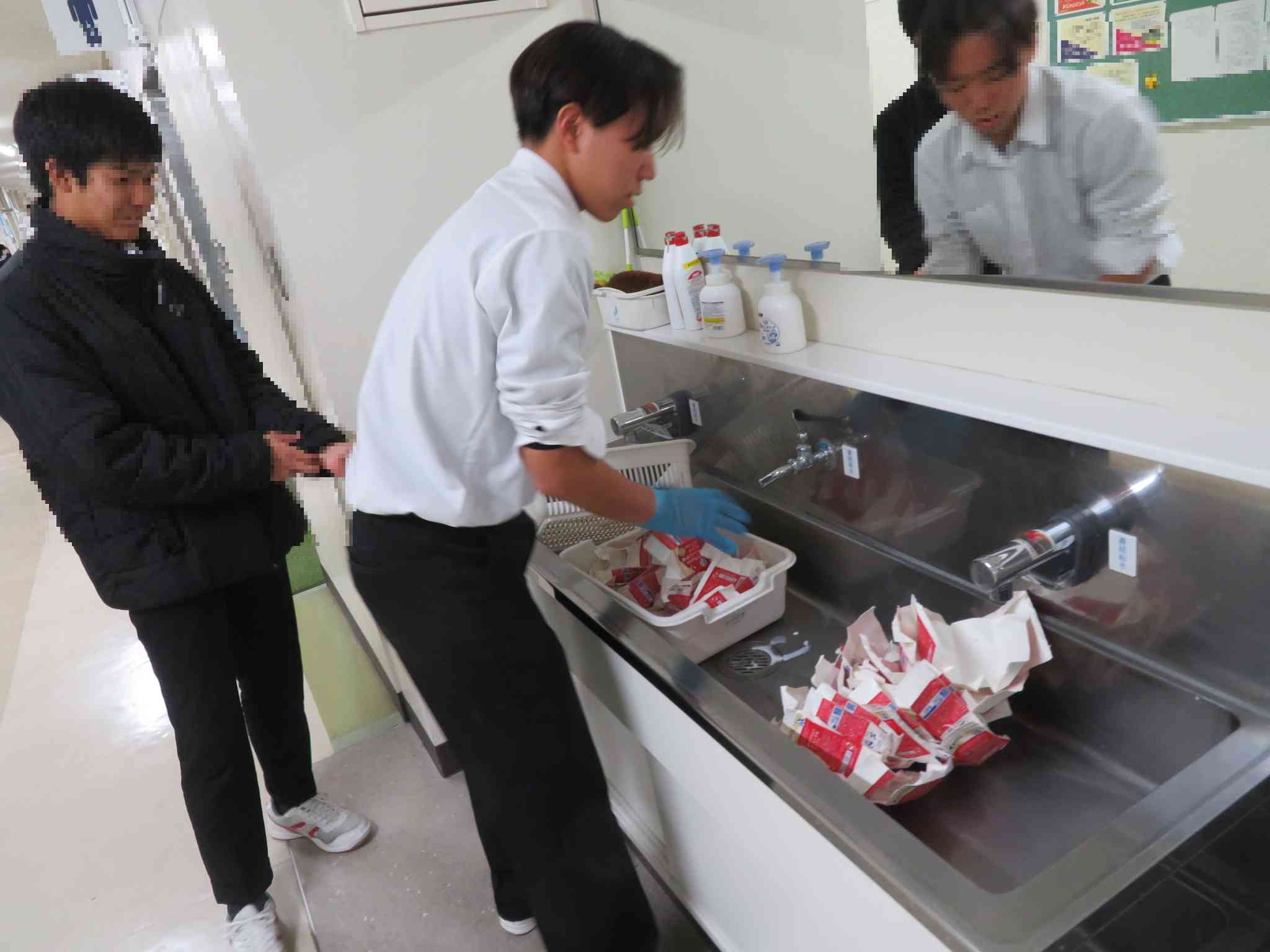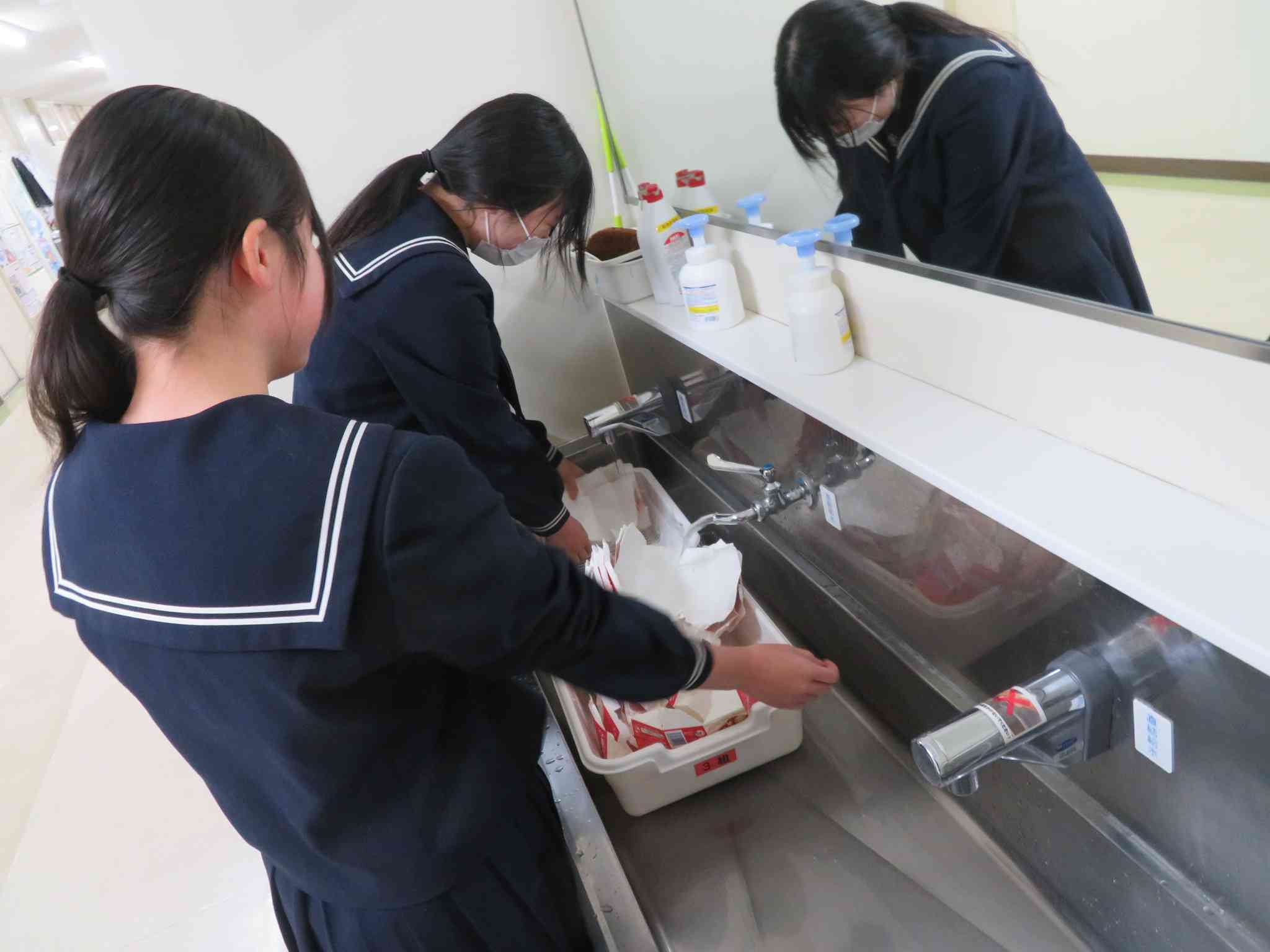 当番の生徒が牛乳パックの洗浄をしています。冷たい水道水で洗ってます。頑張って!