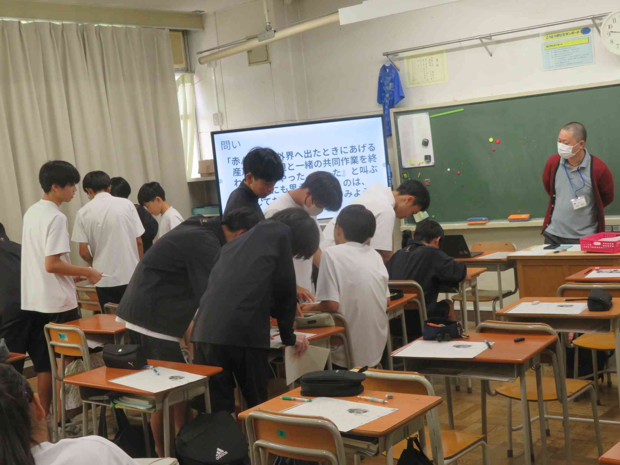 校内授業研究の一環として、第2学年主任が道徳の研究授業を実施しました。 ・目的「生命のもつ偉大な力を敬い、いとおしみ、かけがえのない自他の生命を尊重する態度を育てる」 ・生徒同士が真剣に話し合う姿が印象に残る授業でした。