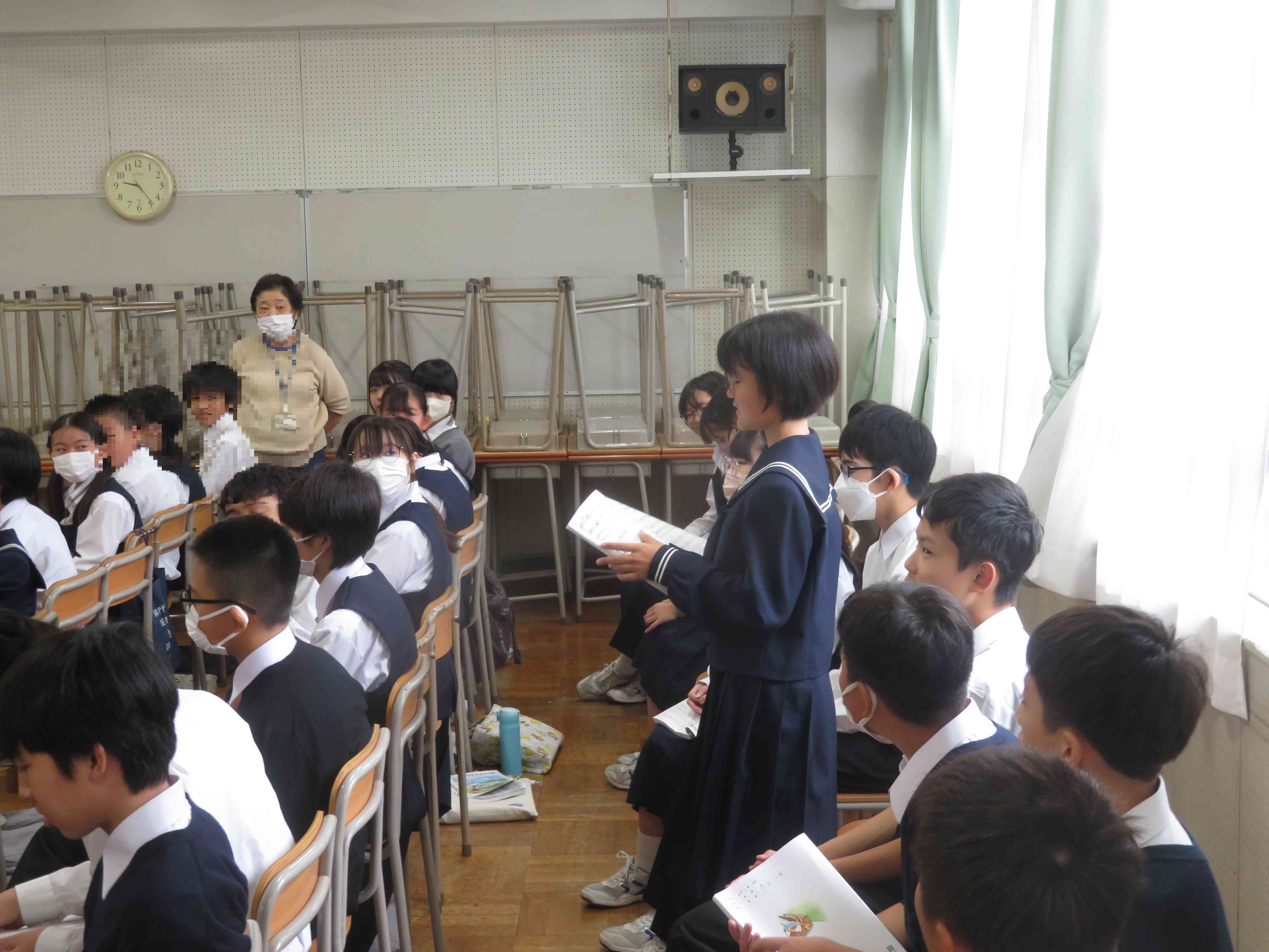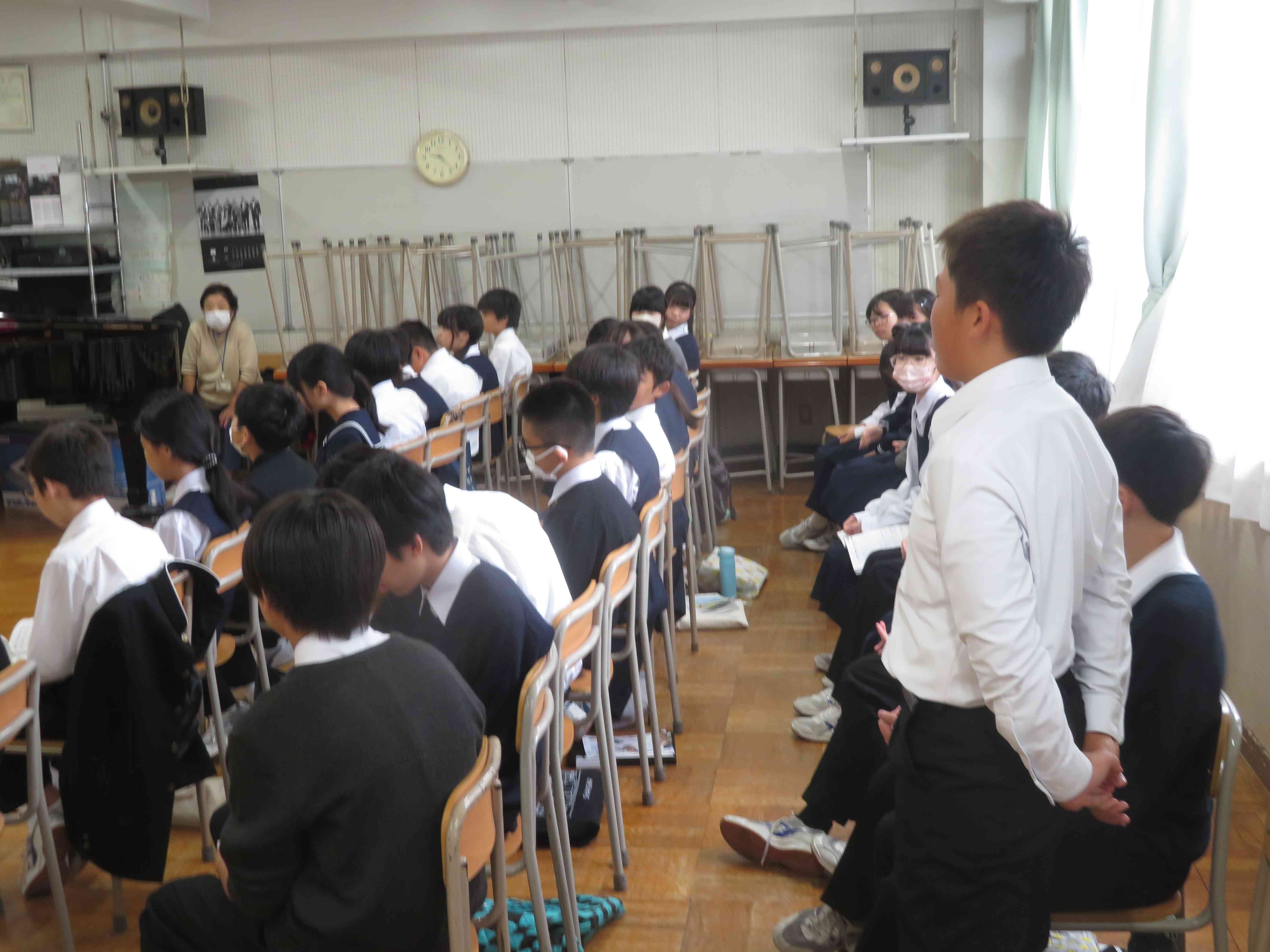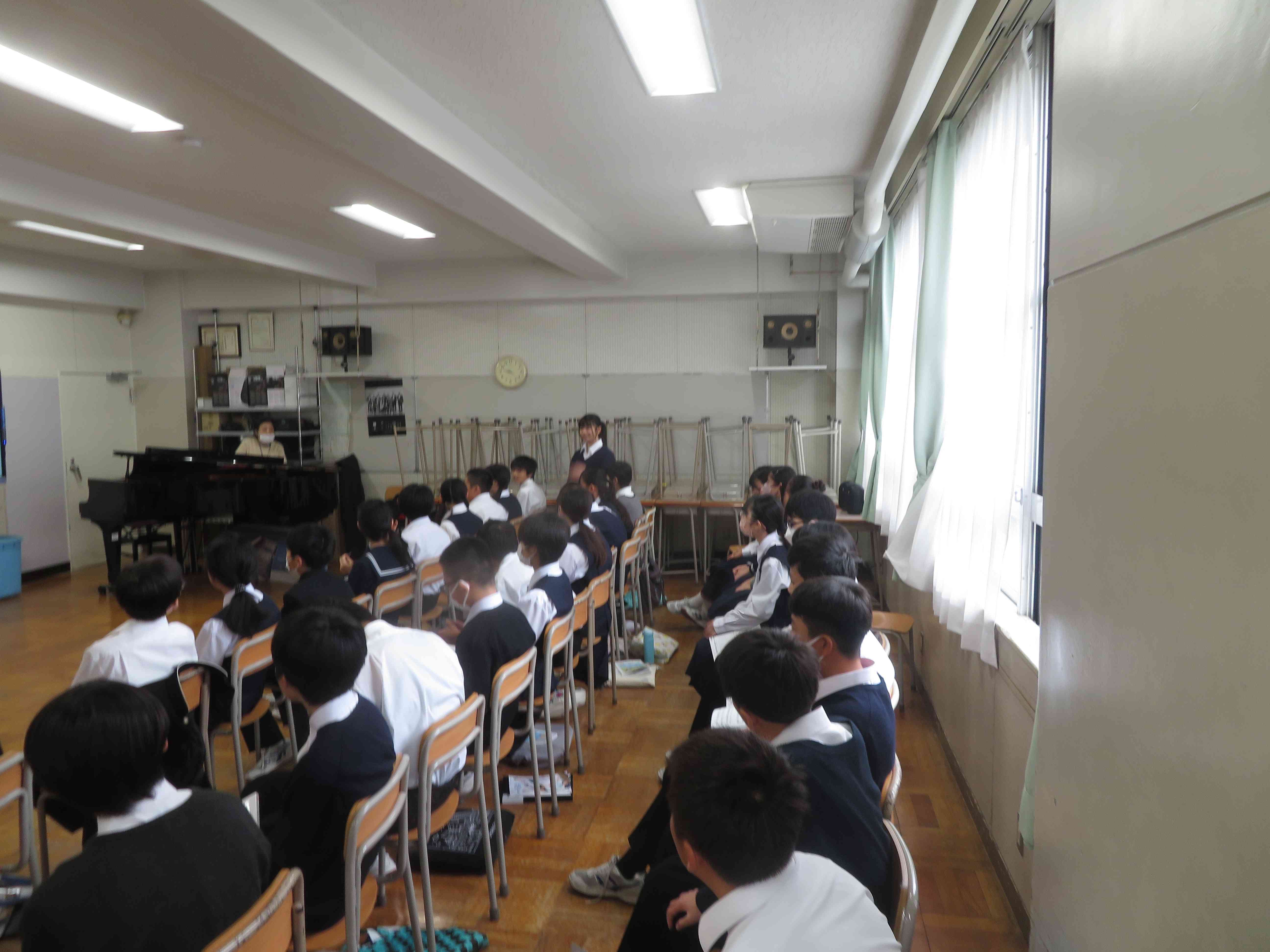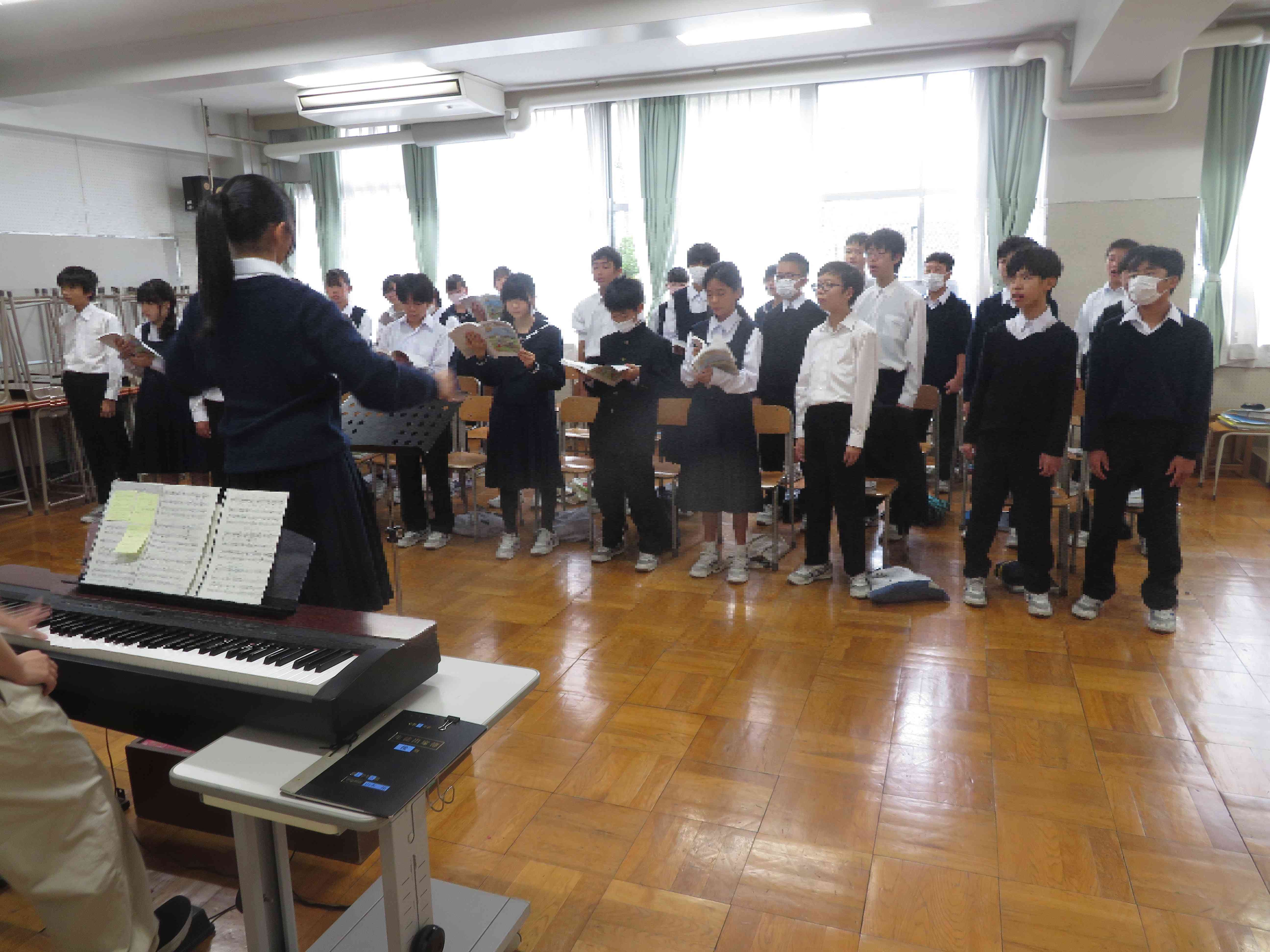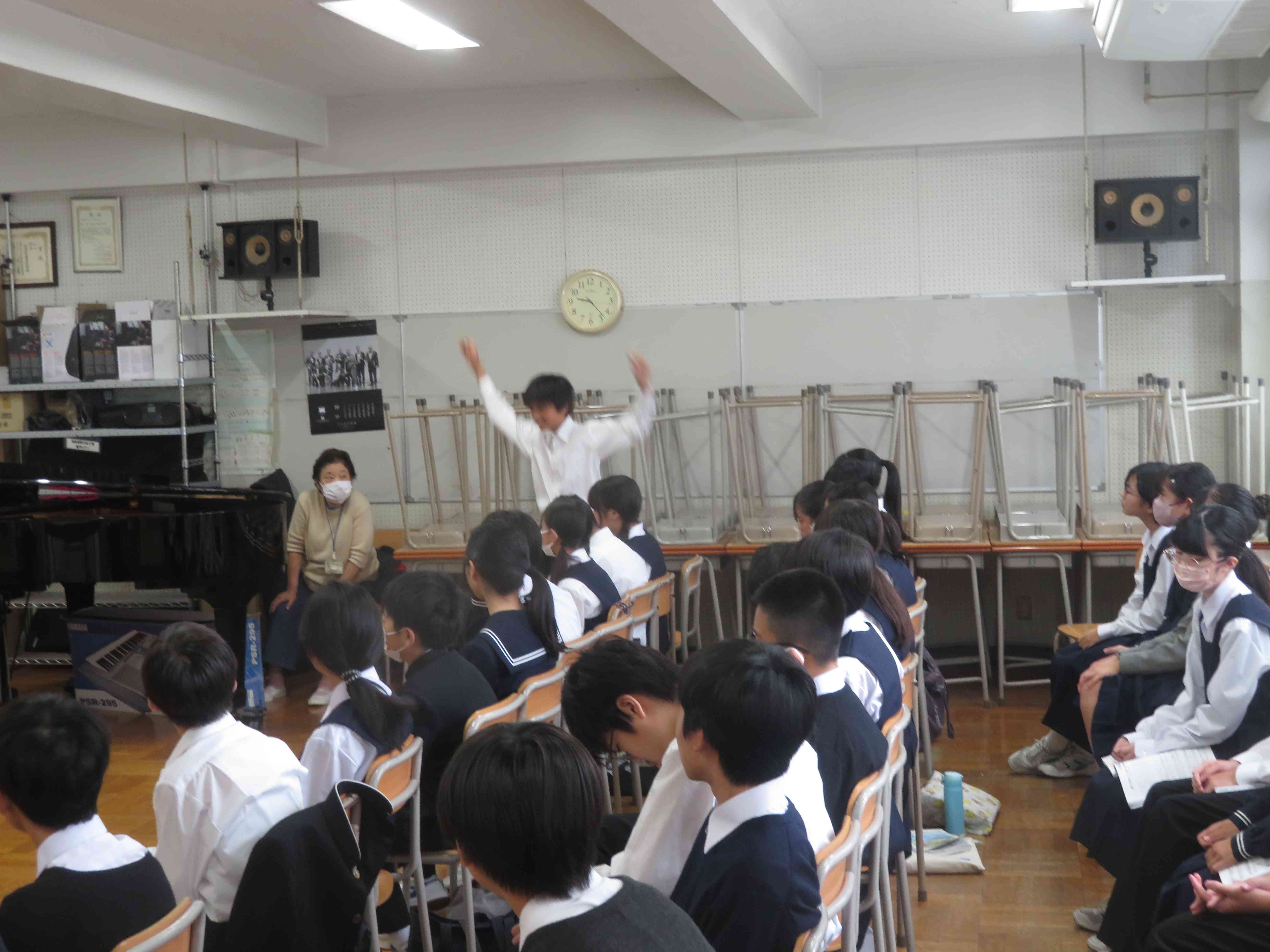 合唱コンクールの練習中です。生徒が自由にクラスメイトに意見・感想を言っています。お互いに話合いながら練習をしています。