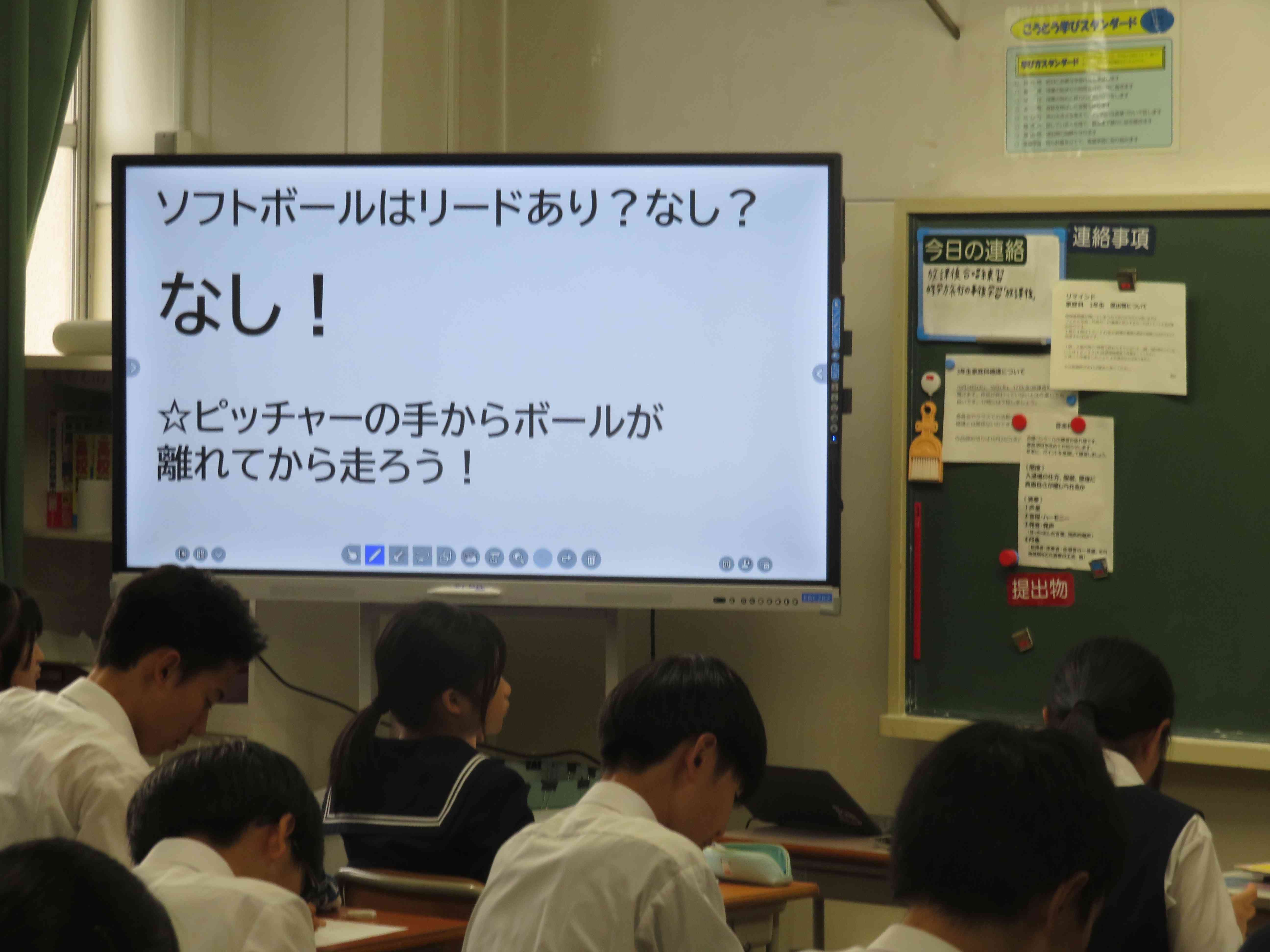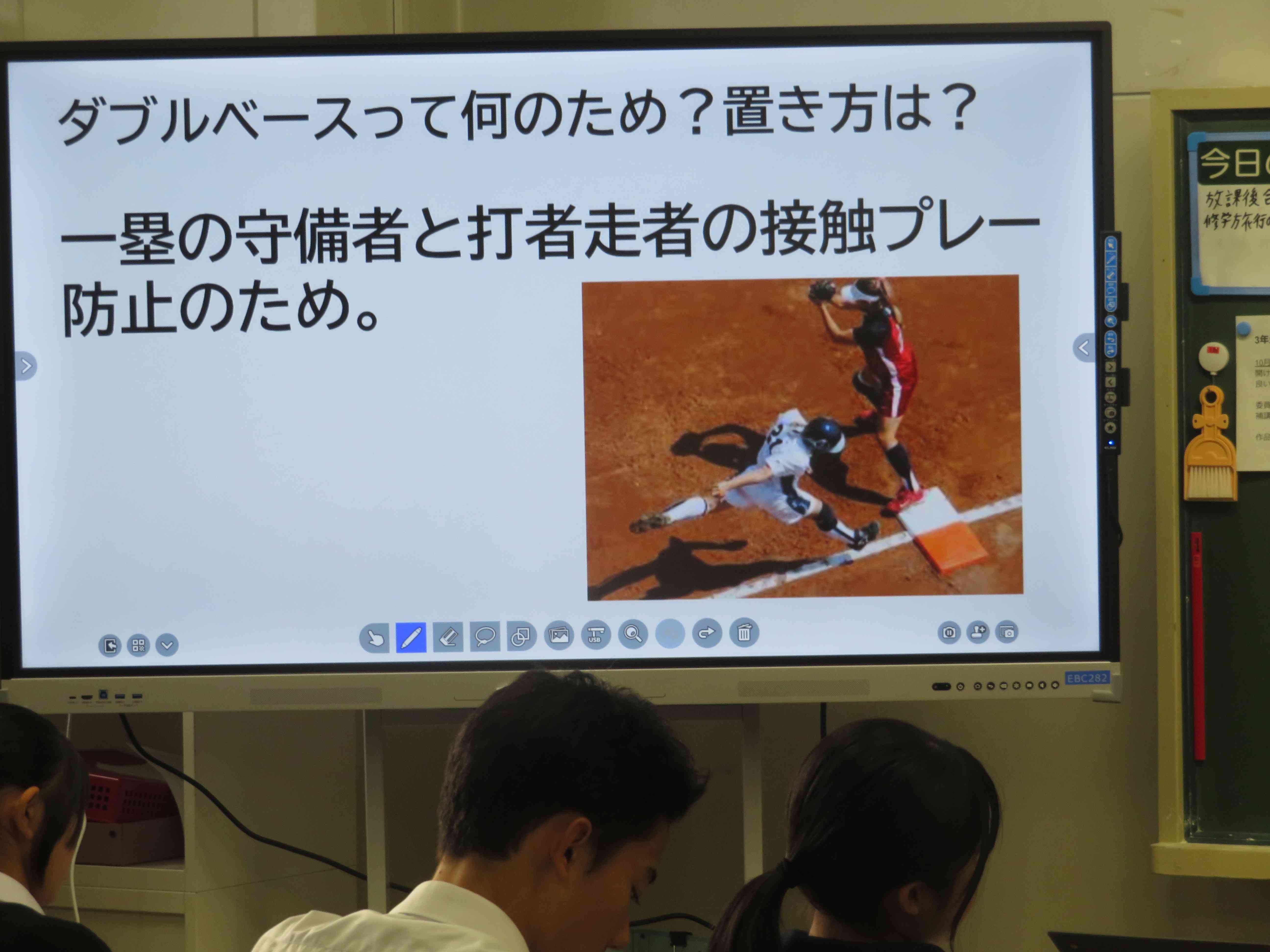 ソフトボールのルールを電子黒板を使用して学んでいます。