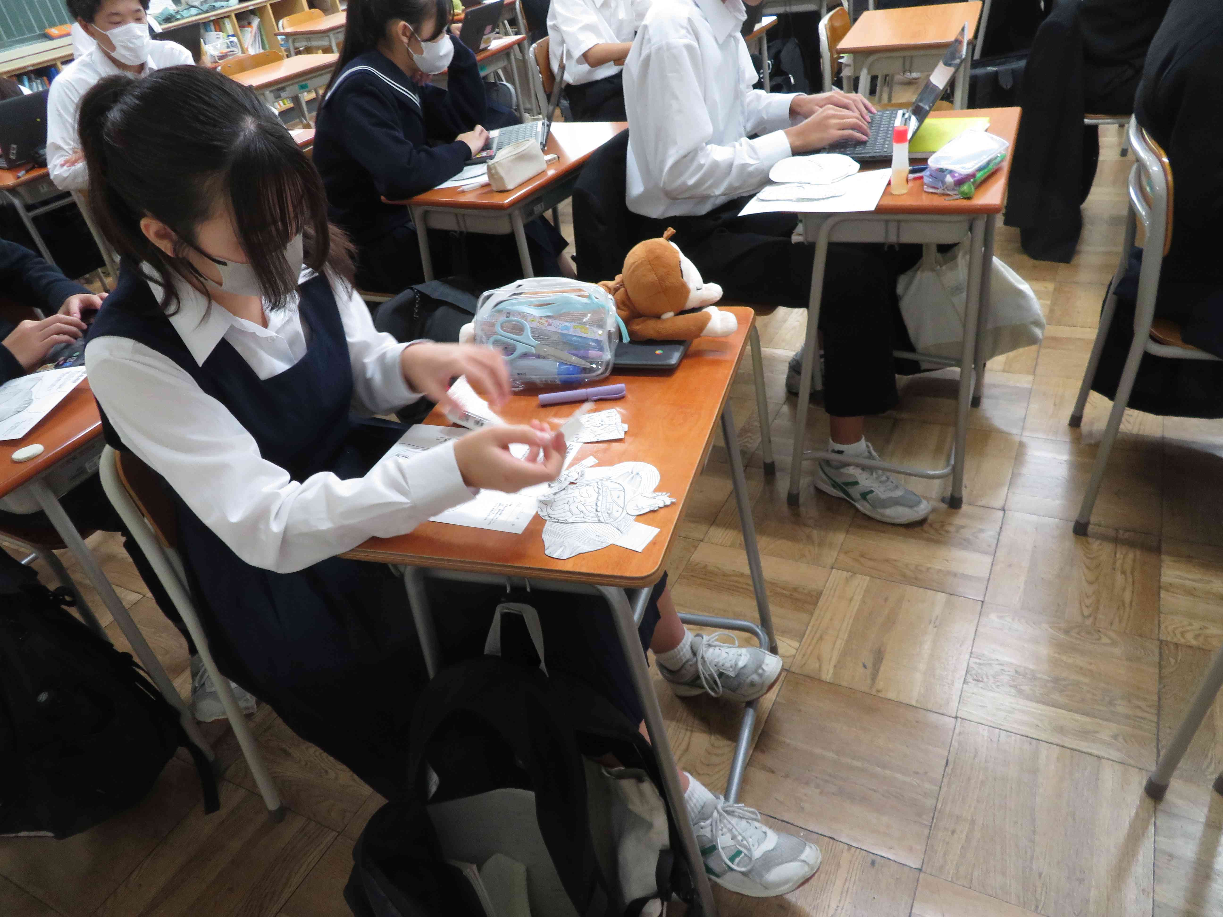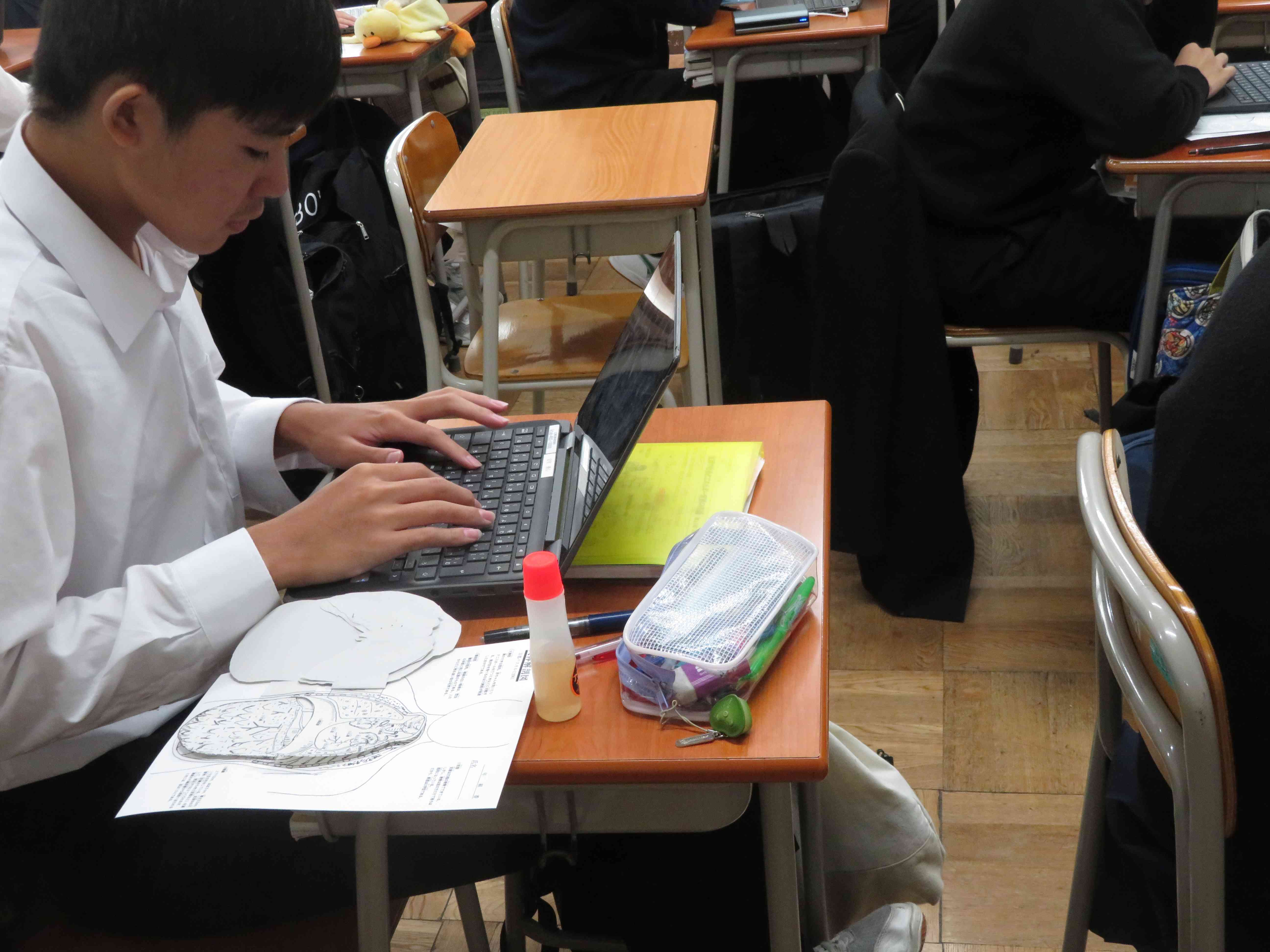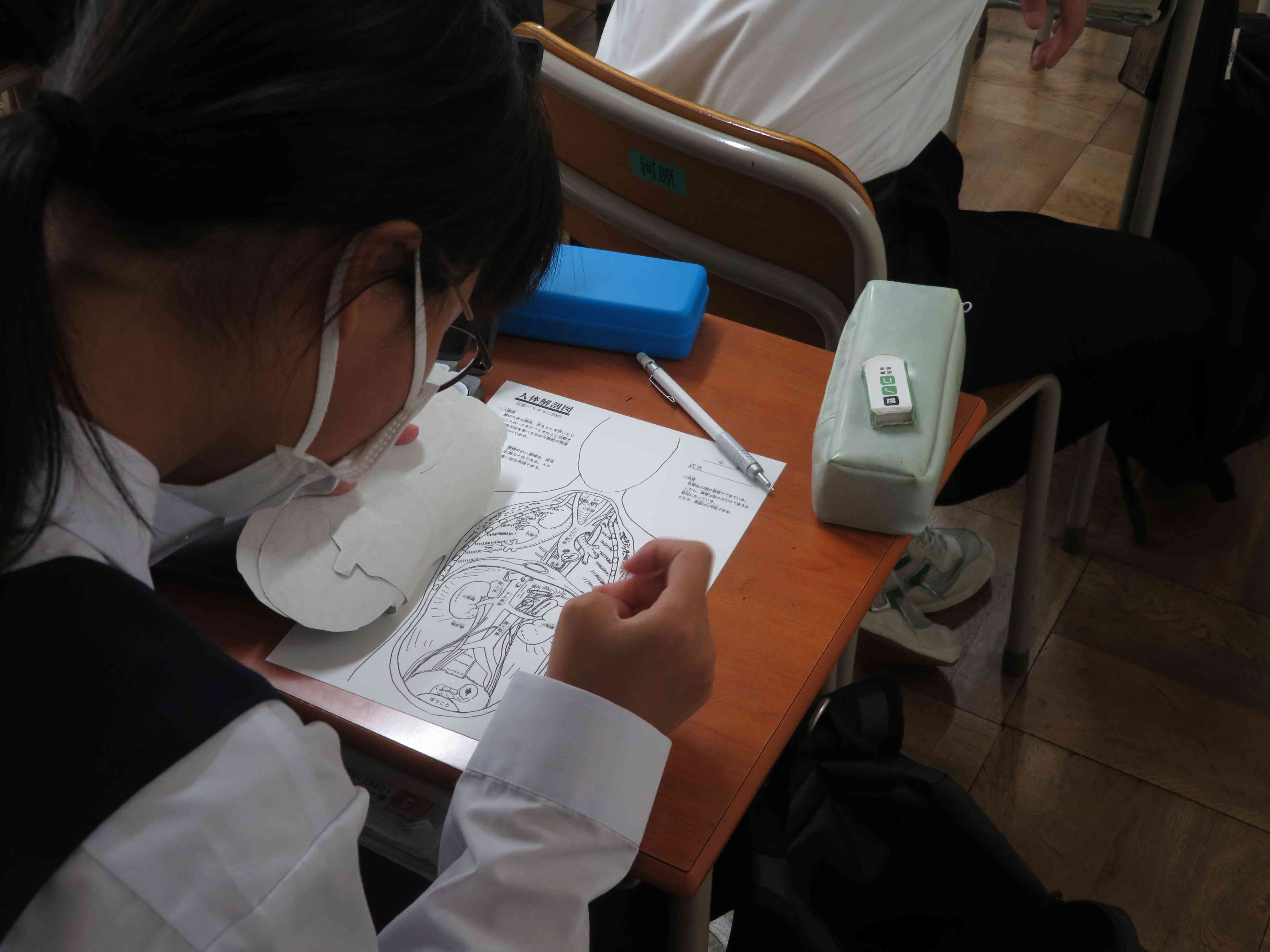 人間の体の構造について学んでいます。プリントから人体解剖図をつくっています。