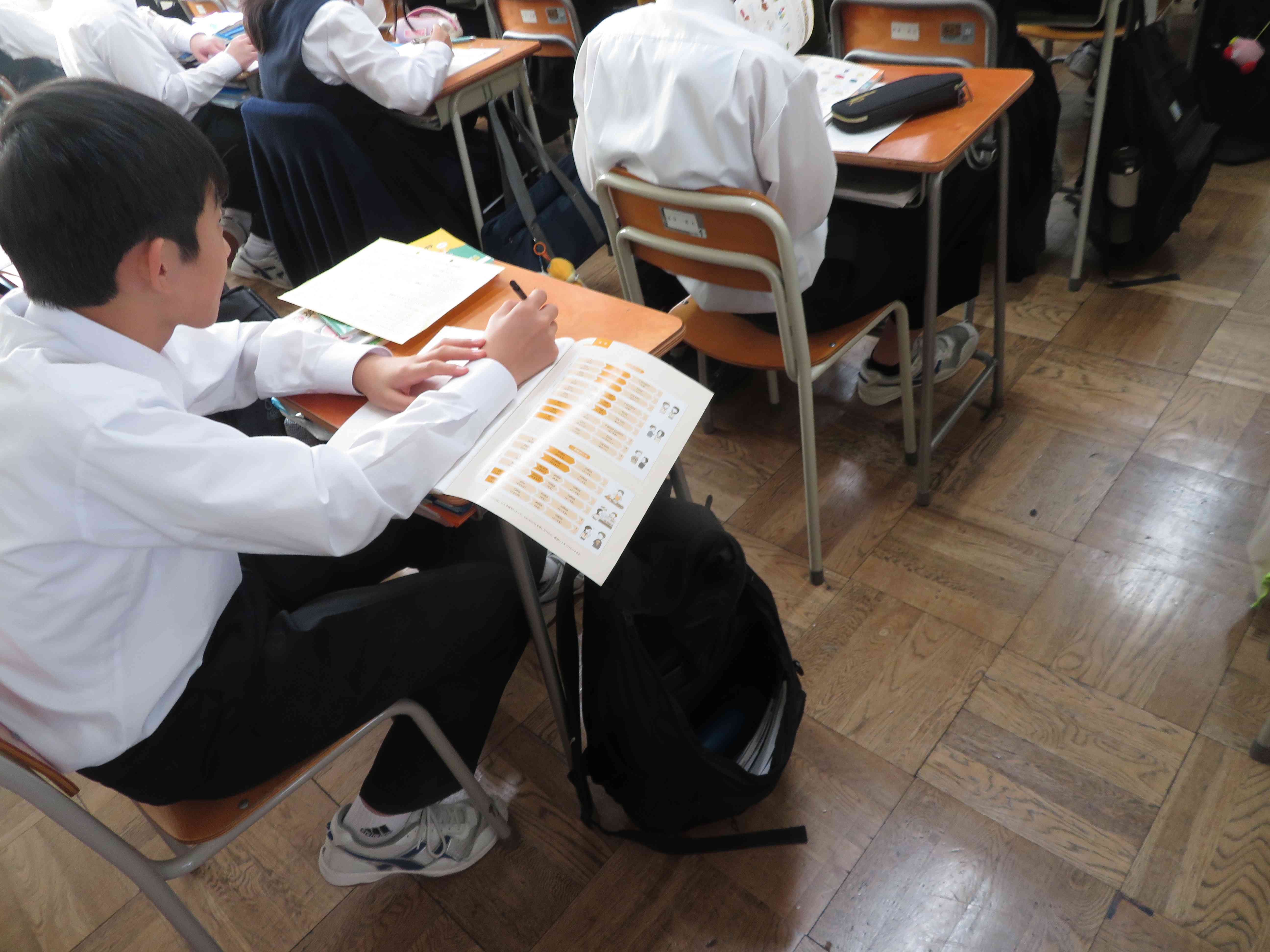 お互いに学習した内容を見せ合い、確認しています。確認し合うことで理解が深まります。