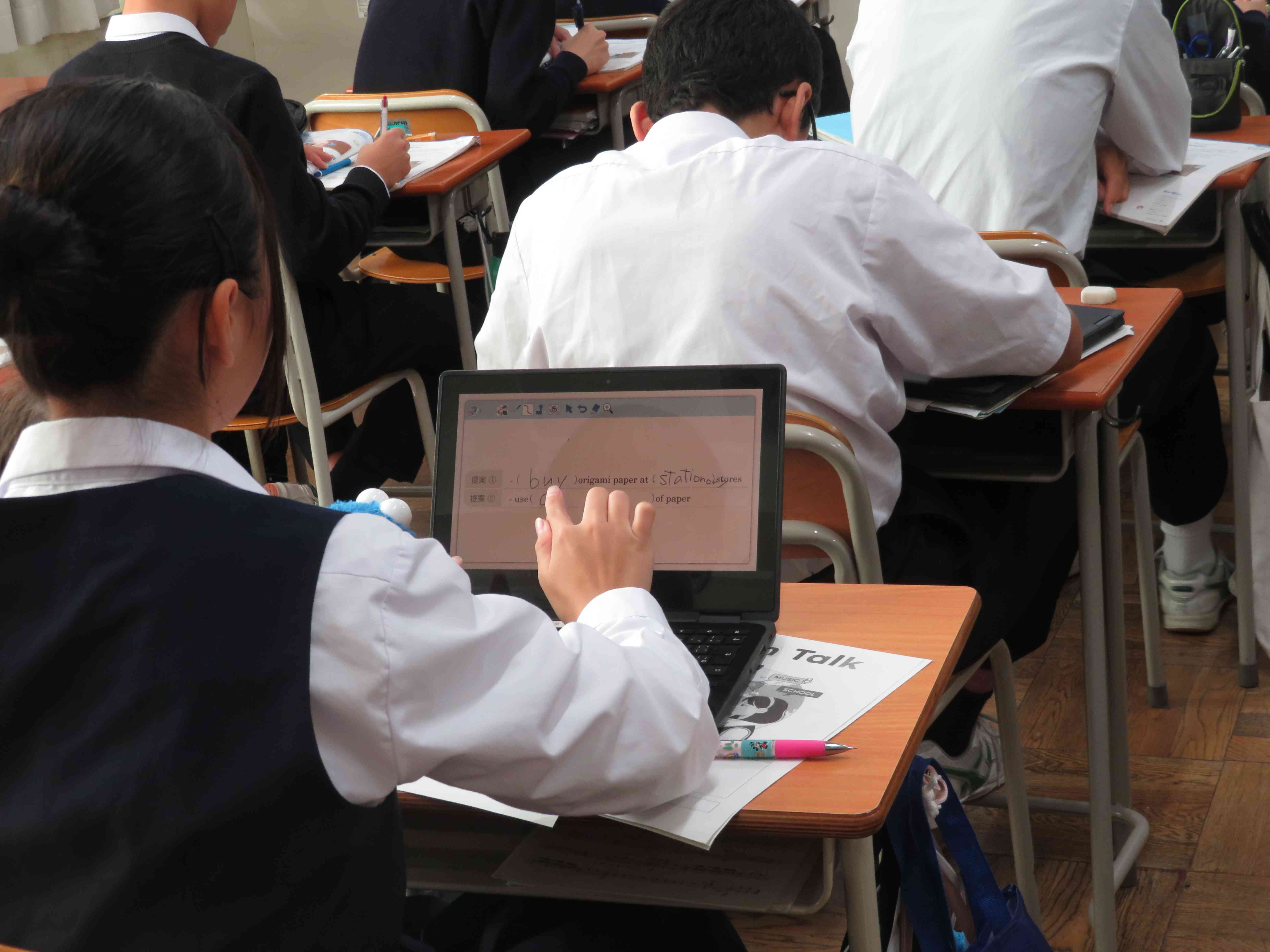 明るく楽しい雰囲気で学習しています。ICT・タブレット端末をフルに活用しています。